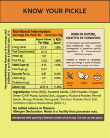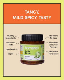 Savour the richness of Homepick's Divine Amla Pickle, a tapestry woven from a divine mix of amla, green chilli, ginger, fennel seeds, fenugreek seeds, chilli powder, rock salt, jaggery & the unique touch of mustard oil. This pickle offers an extraordinary dance of flavours, where the mustard oil imparts a subtle pungency & a delightful hint of smokiness. Beyond its gourmet allure, Amla contributes its renowned health benefits, making each jar a divine fusion of taste & well-being crafted by Homepick.