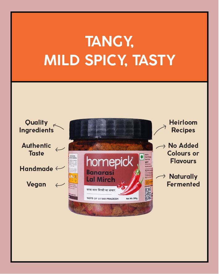 Homepick's Banarasi Lal Mirch Pickle (or Bharva Lal Mirch as traditionally called) brings the flavours of Vanarasi straight to your home. These enormous red chillies are stuffed with a spicy blend of fennel seeds, amchoor, kalonji, fenugreek seeds, cumin seeds & chilli powder, creating a chatpata & namkeen flavour that will tingle your taste buds. This authentic & traditional Indian recipe will have you hooked with every bite. Experience the true essence of Vanarasi in your meals! Traditional & full of flavours, it’s a must-try!