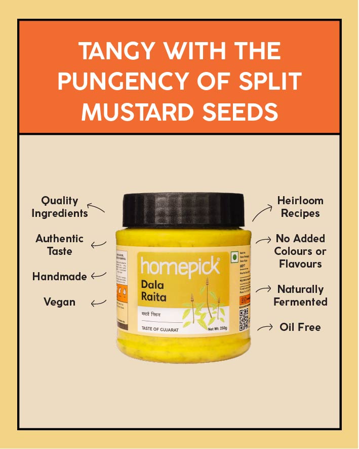 Dala Raita is a hidden gem of Gujarati cuisine, a traditional preparation that tantalizes your taste buds with its unique blend of split mustard seeds, water from raw mangoes & the coleus plant stem. It mirrors the boldness of mustard paste & can surprise you with a wasabi-like kick. Traditionally served as a side dish or with buttermilk & rice, Dala Raita is also a delightful companion to sandwiches, pizzas & quesadillas. Savour the time-honored craftsmanship of Dala & bring the vibrant flavours of Gujarat to your table today.