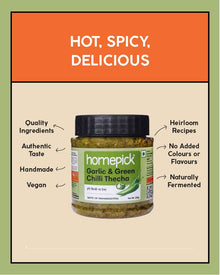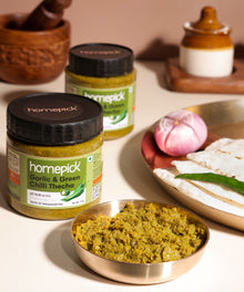 Elevate your dining experience with Homepick's Garlic & Green Chilli Thecha, a Maharashtrian specialty that promises to spice up your meals. Crafted from the finest garlic, fiery green chillies & a splash of tangy lemon juice, this thecha is a symphony of bold flavours designed to tantalize your taste buds.