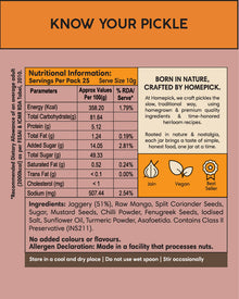 Jaggery (51%), Raw Mango, Split Coriander Seeds, Sugar, Mustard Seeds, Chilli Powder, Fenugreek Seeds, Iodised Salt, Sunflower Oil, Turmeric Powder, Asafoetida. Contains Class II Preservatives (INS211).