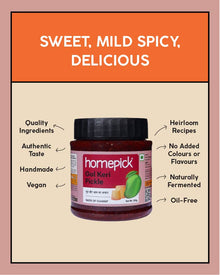 Indulge in the sweet & spicy allure of Homepick's Gol Keri Pickle, a traditional Gujarati delicacy that weaves together the finest flavours of the region. Crafted with top-quality Rajapuri mangoes, this sweet mango pickle is a delightful fusion of sweet & spicy notes, courtesy of the perfect blend of jaggery & kashmiri red chilli.
