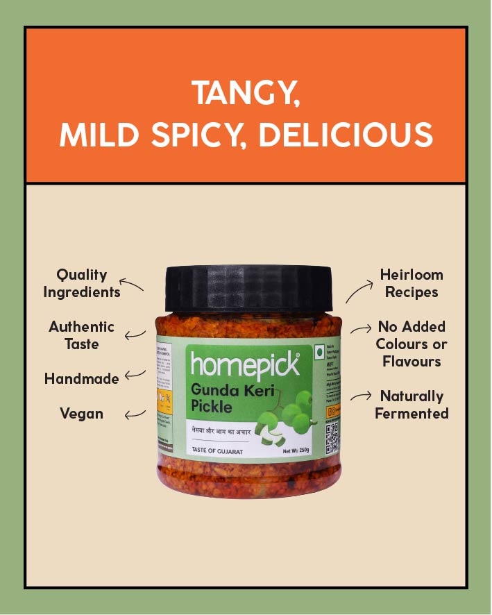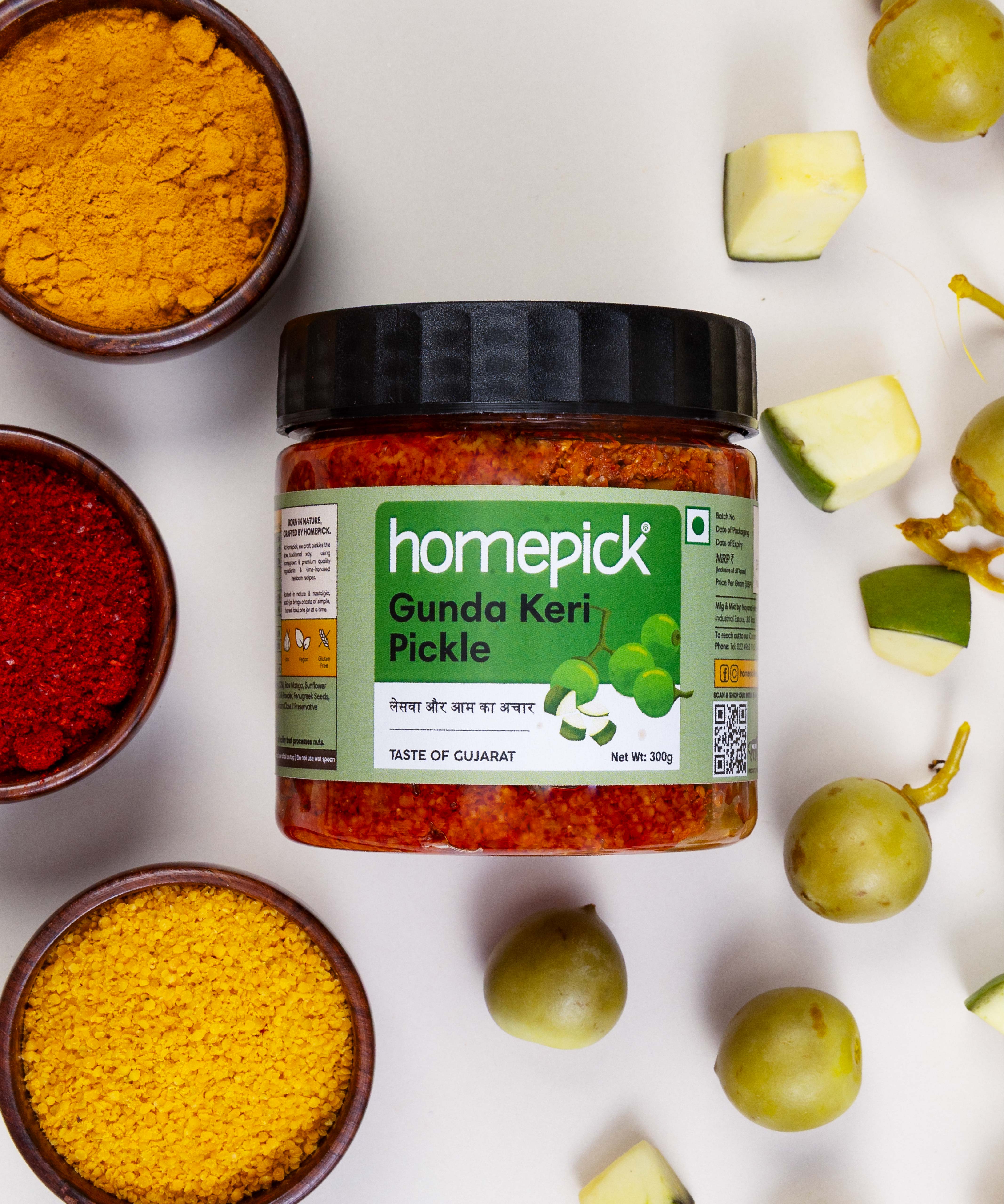 Embark on a culinary journey with Homepick's Gunda Keri, a meticulous blend of tradition & innovation. Carefully selected Gundas, cleaned & deseeded, become vessels for a vibrant mix of grated raw mango, mustard, fenugreek seeds & a touch of chilli powder. Diced raw mango adds a tangy twist, creating a symphony of flavours that evolves during a patient week of stirring. Matured for at least a month, each jar holds the essence of tradition & the dedication we bring to every batch. Savour the fusion of timeless taste & modern craftsmanship in Homepick's Gunda Keri Pickle.