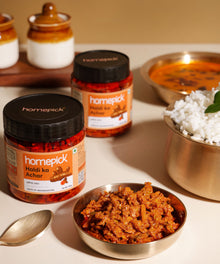 Savour the dual pleasure of taste & health with Homepick's Haldi Ka Achar. Crafted with fresh turmeric, renowned for its myriad health benefits, this pickle offers a burst of wellness in every jar. Turmeric, celebrated for its anti-inflammatory & antioxidant properties, becomes a flavourful ally in promoting a robust immune system & digestive health.
