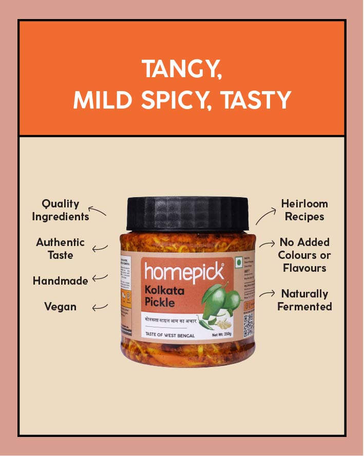 Versatile & bursting with flavours, Homepick's Kolkata Pickle is a perfect accompaniment to a range of dishes, from traditional Bengali fare to global cuisine. Add a touch of Kolkata's culinary magic to your table with this exquisite pickle that embodies the spirit of the city's diverse & rich gastronomic traditions.