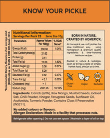 Carrots (60%), Raw Mango, Mustard Seeds, Iodised Salt, Chilli Powder, Vinegar, Fenugreek