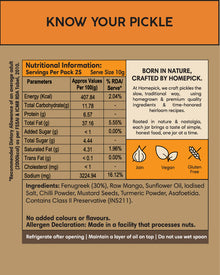Sun-dried pieces of raw mangoes, bathed in the warmth of Gujarat's sun, come alive in this pickle. Whole fenugreek seeds, mustard seeds, kashmiri chilli powder & salt join the dance of flavours, creating a symphony that matures over several days. Witness the transformation as the bitter fenugreek seeds absorb the tangy essence of raw mangoes, softening into a delightful harmony. Homepick's Methya Mango Pickle is more than a condiment; it's a celebration of Gujarati heritage & the vibrant spirit of summer.