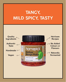 Embark on a journey through the vibrant flavours of Gujarat with Homepick's Methya Mango Pickle, a cherished tradition in many Gujarati households during the summer months. Crafted using the finest Ladva Mangoes sourced from Gujarat, this pickle is a testament to the region's culinary excellence.