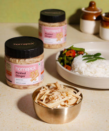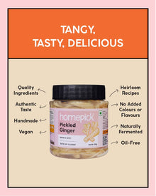 Immerse yourself in the crisp, tangy notes of Homepick's Pickled Ginger, where each jar encapsulates the essence of simplicity & well-being. Enjoy a guilt-free treat that not only satisfies the palate but also embraces the timeless virtues of ginger in every flavourful strip.