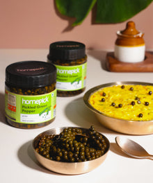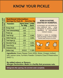 Homepick's Pickled Green Pepper is made using fresh green peppers , fresh from the pepper trails of southern India that are brined in a mixture of water, salt, vinegar, lemon juice & a touch of turmeric powder. The result is a tangy & refreshing pickle with a mild to medium spiciness that adds a zesty kick to any dish. The crisp texture of the green peppers makes it a perfect oil free accompaniment to every dishes. It's a great option for those who enjoy a bit of heat in their pickles. Try it as a garnish for your salads.