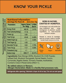 Raw Mango (50%), Mustard Oil, Chilli Powder, Iodised Salt, Mustard, Fenugreek, Fennel Seeds, Cumin, Coriander, Nigella Seeds, Turmeric Powder, Asafoetida, Contains Class II Preservative (INS211).