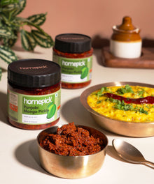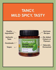 Our Punjabi Mango Pickle isn't just a condiment; it's a journey through time & tradition. The result? A pickle that's irresistibly tangy, mildly spicy & a testament to the authentic flavours of Punjab. Let your taste buds revel in this sun-kissed delight by Homepick that's as genuine as it gets.