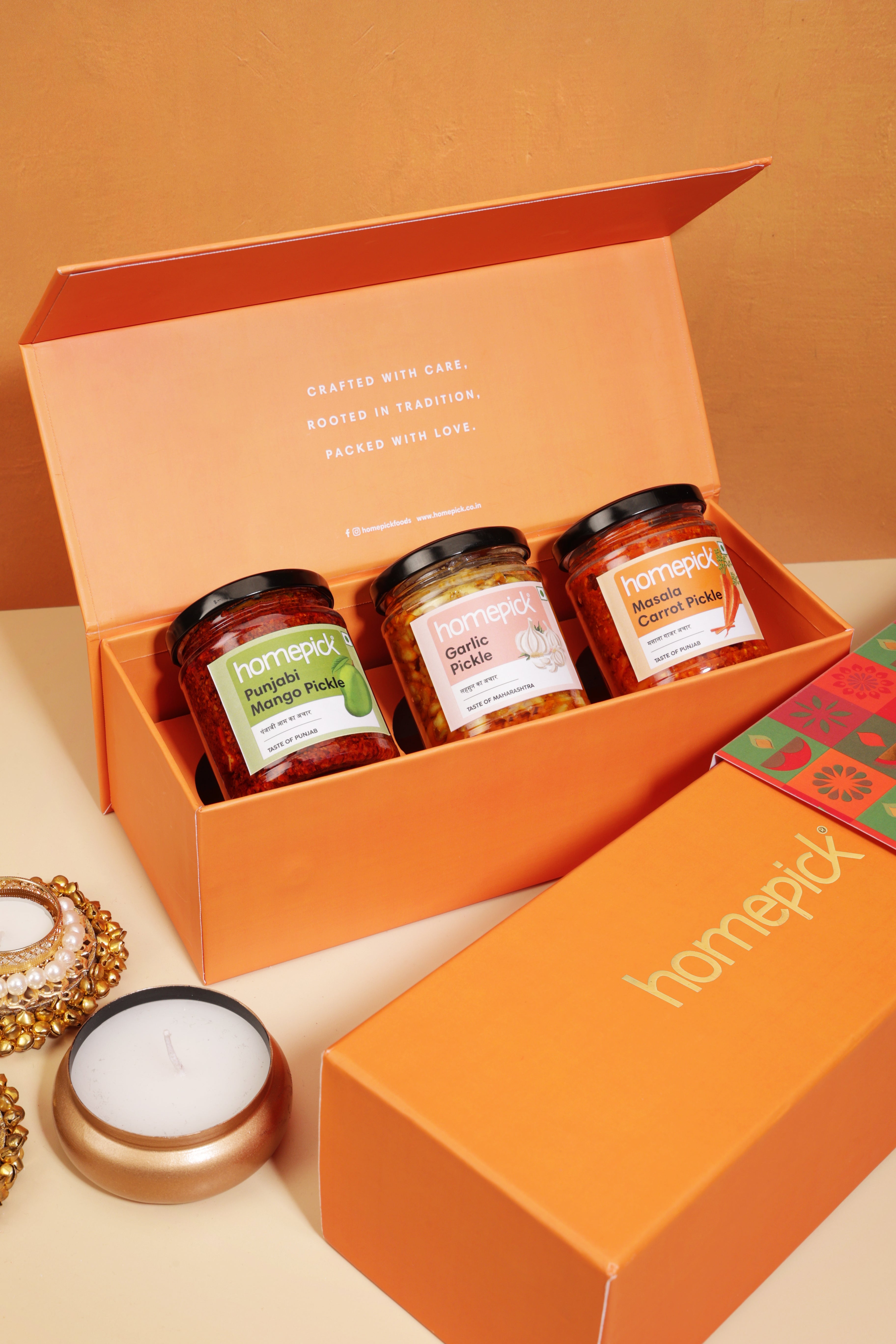 This festive season, Homepick's pickle hamper is a vibrant & thoughtful way to celebrate coming together. With a mix of bold flavours & traditional recipes, it brings a delicious twist to your festive gathering. Like love, pickles are a long-lasting gift, meant to be savoured over time & shared with those who matter most. Amongst the clutter of sweets & mithai, our hampers provide a unique gifting option with a beautiful gold foiled festive box, adding that extra touch of warmth & nostalgia. It's a small reminder of home, heritage, & the joy of good food—perfect for gifting or indulging.