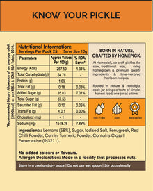 Lemons (58%), Sugar, Iodised Salt, Fenugreek, Red Chilli Powder, Cumin, Turmeric Powder, Contains Class II Preservative (INS211).